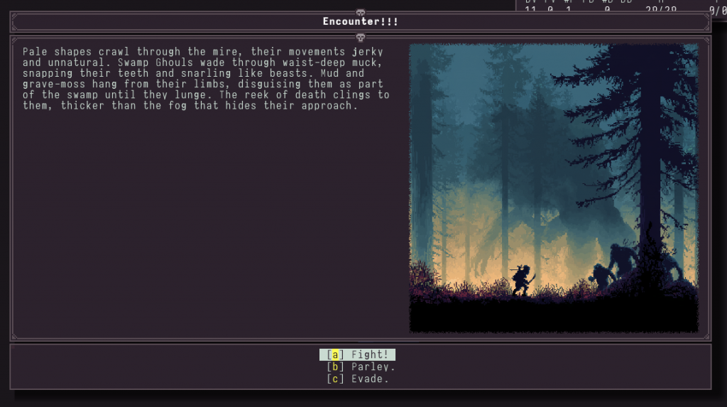 Encounters can be handled in various interactive ways, combat being a very typical way of coping with an encounter. Later on there will be lots of other kinds of wilderness encounters, like travelling merchants you can trade with, caravans you might want to deal with, patrols from cities seeking troublemakers and many others. But for now it’s all about random (combat) encounters.