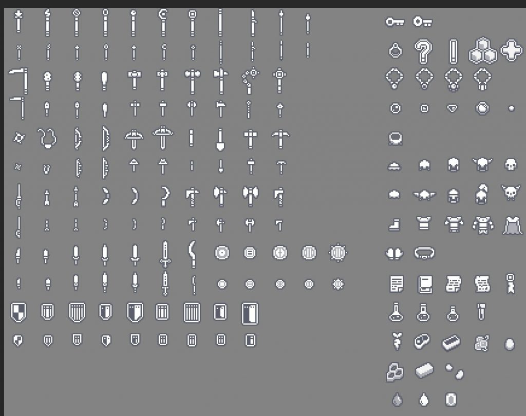 Having items means that we should show some of them. We have decided to go for a healthy mix, e.g. monsters will show weapons and shields to differentiate them a lot more. Here’s a sample: